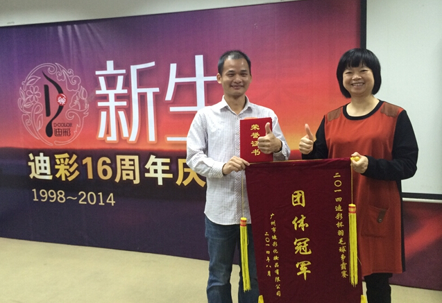 生命在于運(yùn)動,體育洋溢青春。在這秋風(fēng)送爽,丹桂飄香時節(jié),讓我們備受矚目的“2014迪彩杯羽毛球爭霸賽”也圓滿的畫上了句號。在此次賽事中分別設(shè)立了冠亞季(團(tuán)體獎、男子單打、女子單打)三大獎項,頒獎典禮于11月3日在公司總部培訓(xùn)室舉行,頒獎嘉賓由許桂萍董事長、曾佑春工會主席擔(dān)任。