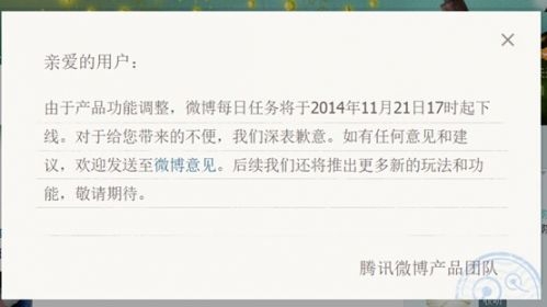 11月21日消息,騰訊微博發(fā)布公告稱,由于產(chǎn)品功能調(diào)整,微博每日任務(wù)將于11月21日17時(shí)起下線,這也表示騰訊微博在日常運(yùn)營(yíng)方面的進(jìn)一步減少投入。